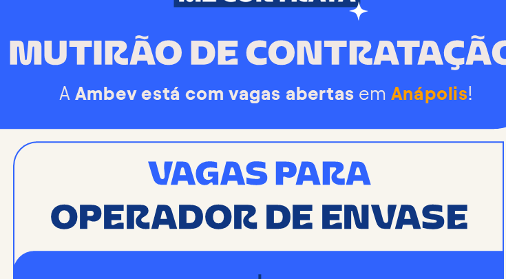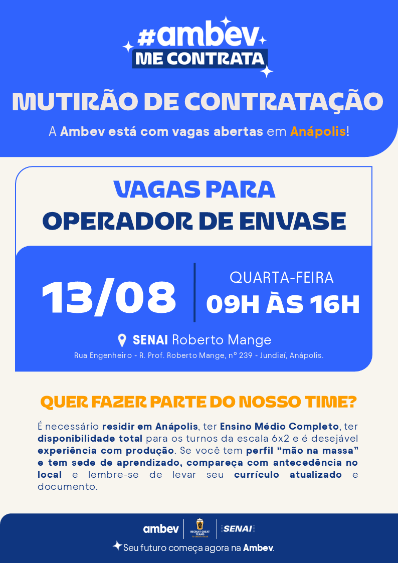 A Ambev vai promover, em 13 de agosto de 2025, um mutirão de vagas para contratação imediata de Operadores de Envase em sua Filial Cebrasa, em Anápolis (GO). O evento será realizado no SENAI Roberto Mange, no bairro de Jundiaí. Interessados devem comparecer com currículo atualizado e documentos pessoais em mãos, entre 09h e 16h.