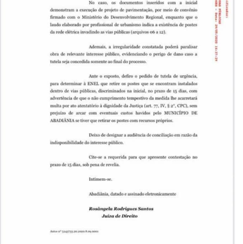 A Assessoria de comunicação da Prefeitura de Abadiânia enviou à redação do Goiás em Tempo a determinação do TJ-GO, onde a Juíza Rosângela Rodrigues dos Santos assina o documento solicitando à Enel que retire os postes que estão instalados dentro de via pública. no prazo de 15 dias.