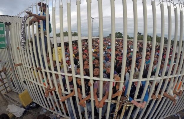 “México, tenha humanidade, deixo-nos passar, não nos trate como os Estados Unidos faz com os mexicanos!”, gritava, com um tom de voz que oscilava entre a raiva e o desespero, um homem trepado sobre as grades.