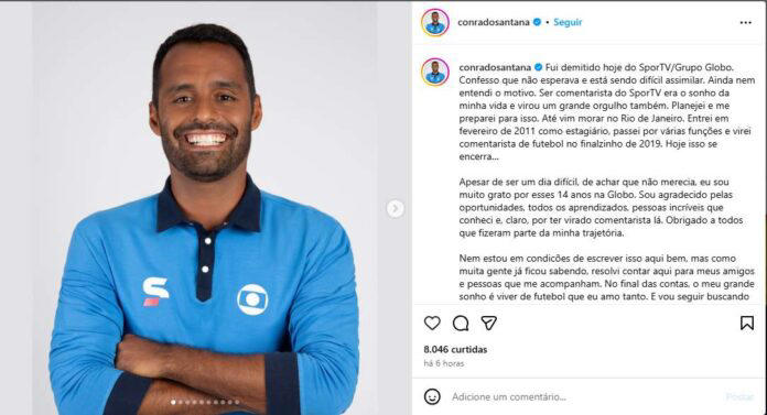 Apesar da decepção com a sua demissão, Conrado aproveitou para agradecer o canal pela trajetória construída ao longo de mais de uma década. “Eu sou muito grato por esses 14 anos na Globo. Sou agradecido pelas oportunidades, todos os aprendizados, pessoas incríveis que conheci e, claro, por ter virado comentarista lá. Obrigado a todos que fizeram parte da minha trajetória”, publicou ele.