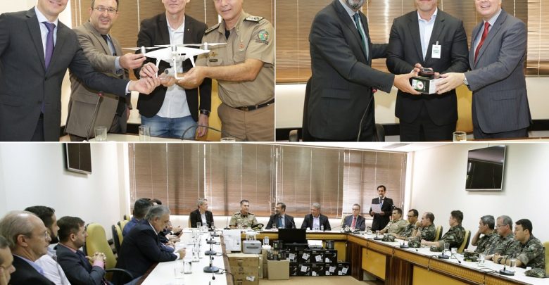 Entrega-DRONES–MontagemO Ministério Público de Goiás (MP-GO) entregou nesta quarta-feira, dia 28, equipamentos que auxiliarão a atuação do Batalhão Ambiental da Polícia Militar e da Secretaria Estadual de Meio Ambiente (Secima) em todo Estado. Entre os equipamentos estão drones, aparelhos de GPS, computadores e impressoras.